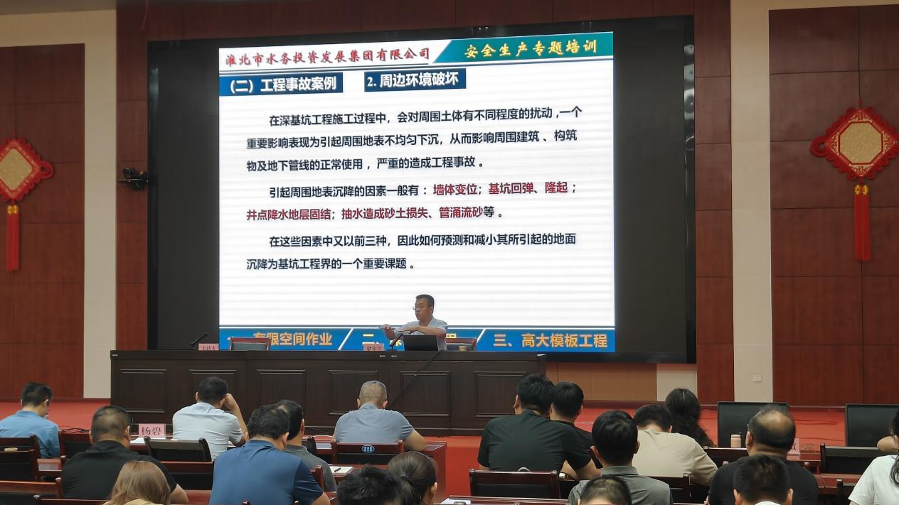 然后,在水务集团总经理杨碧主持下,梁龙喜副教授向水务集团中层以上领导做了安全生产专题培训讲座。主要从有限空间作业、深基坑工程、高大模板工程等三方面内容展开。他结合多年从业经验和工程案例,深入浅出地讲解了安全生产的原则以及应用实践,指出安全生产是企业发展的基石,严格遵守安全操作规程,树立安全意识,守住安全底线,做好安全工作。