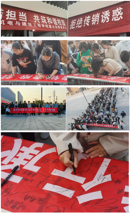 志愿精神,携手共防传销危害。2024年10月30日下午四时,机建学院开展“拒绝传销·守护校园”百人签字活动。活动现场,机建学院组建志愿者数量超五百人,以在“拒绝传销诱惑,践行承诺担当,共筑和谐校园。”横幅上共同签下自己的名字这一形式,表达对拒绝传销的坚定决心。志愿者们签字后,自觉遵守承诺,不参与任何传销活动,积极向身边的同学、朋友和家人宣传防范传销的知识。