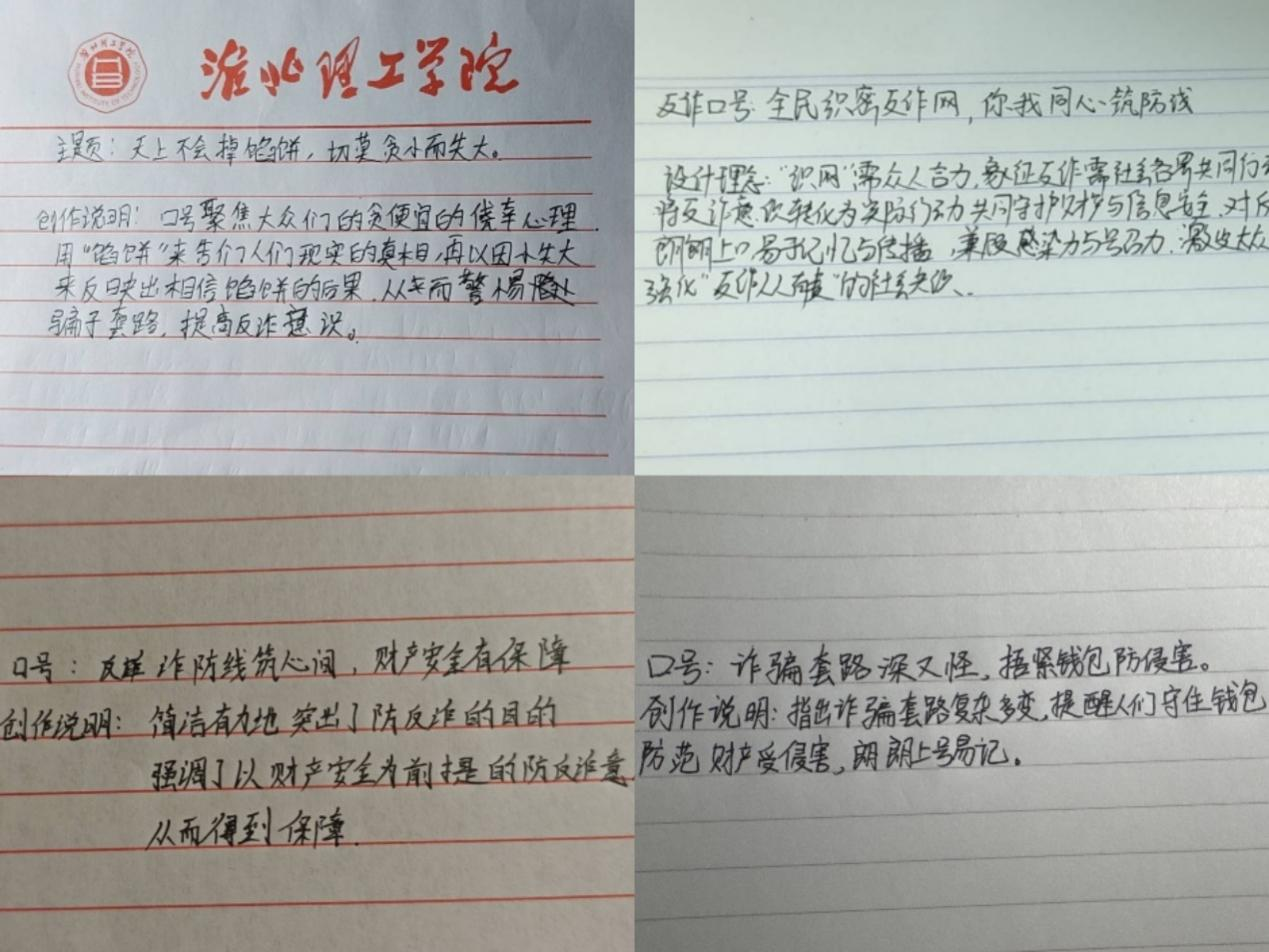设计主题口号活动期间,同学们踊跃参与,投稿作品丰富多样,涌现出诸多精彩口号:“反诈防线筑心间,财产安全有保障”,强调筑牢思想防线对守护财产的重要性;“心筑防线,反诈同行” 突出心与行结合,呼吁携手反诈;“贪念一起易上钩,反诈警钟时刻敲” 聚焦受骗心理根源,以通俗表达警示持续警惕 ;“诈骗套路深又怪,捂紧钱包防侵害” 点明诈骗套路复杂,提醒守好钱袋;“高薪兼职是诱饵,冷静思考不上当” 直击网络兼职诈骗陷阱,倡导理性判断。这些口号紧扣反诈主题,或剖析心理、或揭露套路,用朗朗上口的语言传递防诈智慧。