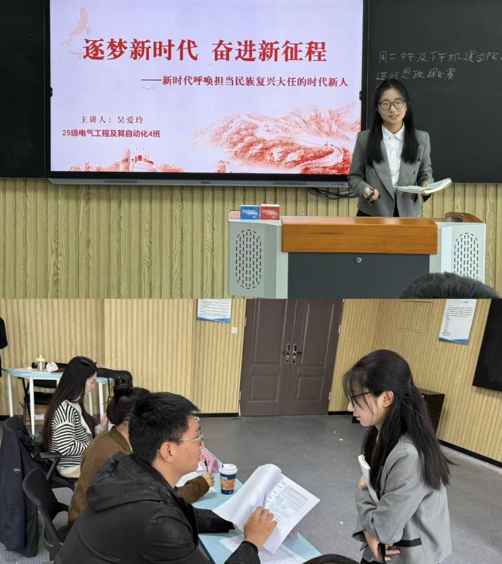 为深入学习贯彻落实全国、全省教育大会精神,深化思政课改革创新,推进“大思政课”建设,tyc5997太阳集团于2025年10月21日在一教211组织开展第四届“大学生讲思政课”大赛院级比赛。院书记助理邓金鑫、辅导员贺沙沙、刘鸿飞、刘萍萍四位老师出席并担任本次赛事评委。