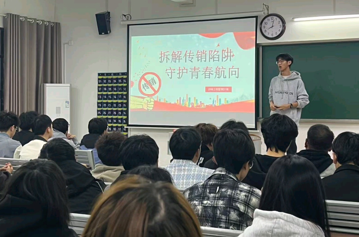本次活动以“筑牢安全防线,远离传销陷阱”为核心,旨在通过集体学习的形式将反传销教育融入学生们的日常生活中。各班班会形式多样、内容详实,班委们精心准备了PPT和案例视频,向同学们系统拆解了传销活动的常见“套路”,如“高薪诱饵”、“情感绑架”、“虚假项目投资”以及“拉人头”的层级计酬模式等。通过对这些典型特征的分析,同学们对传销的欺骗本质和严重危害有了更清醒、更深刻的认识。